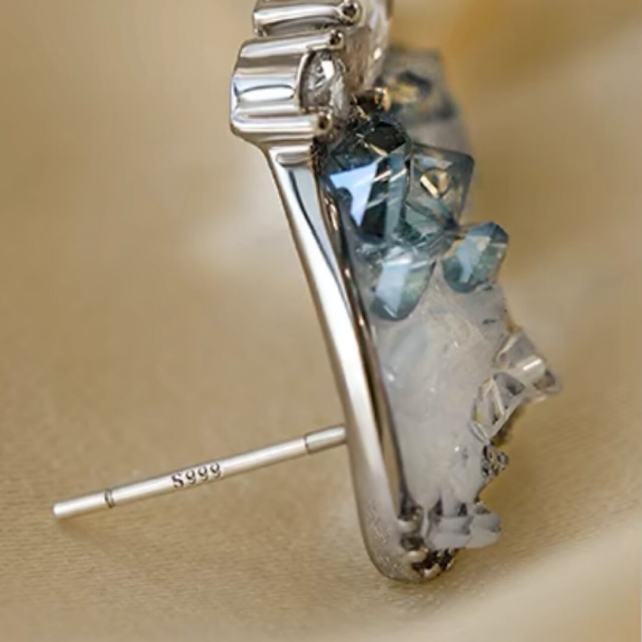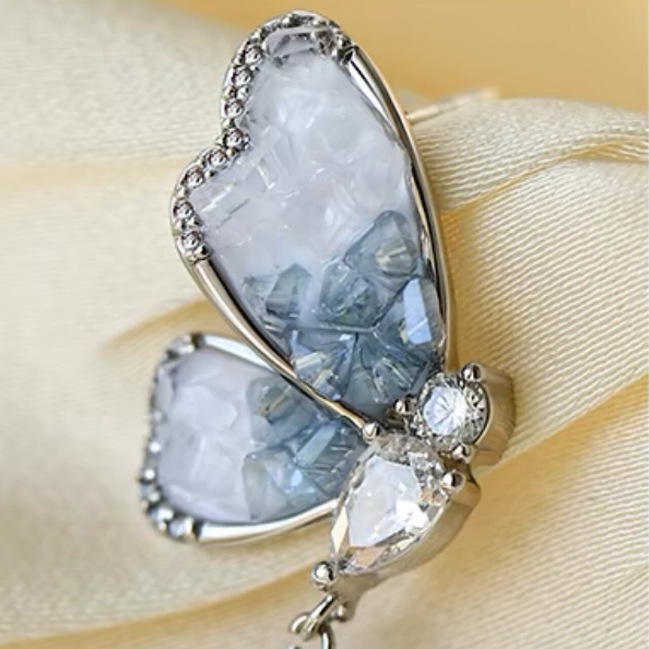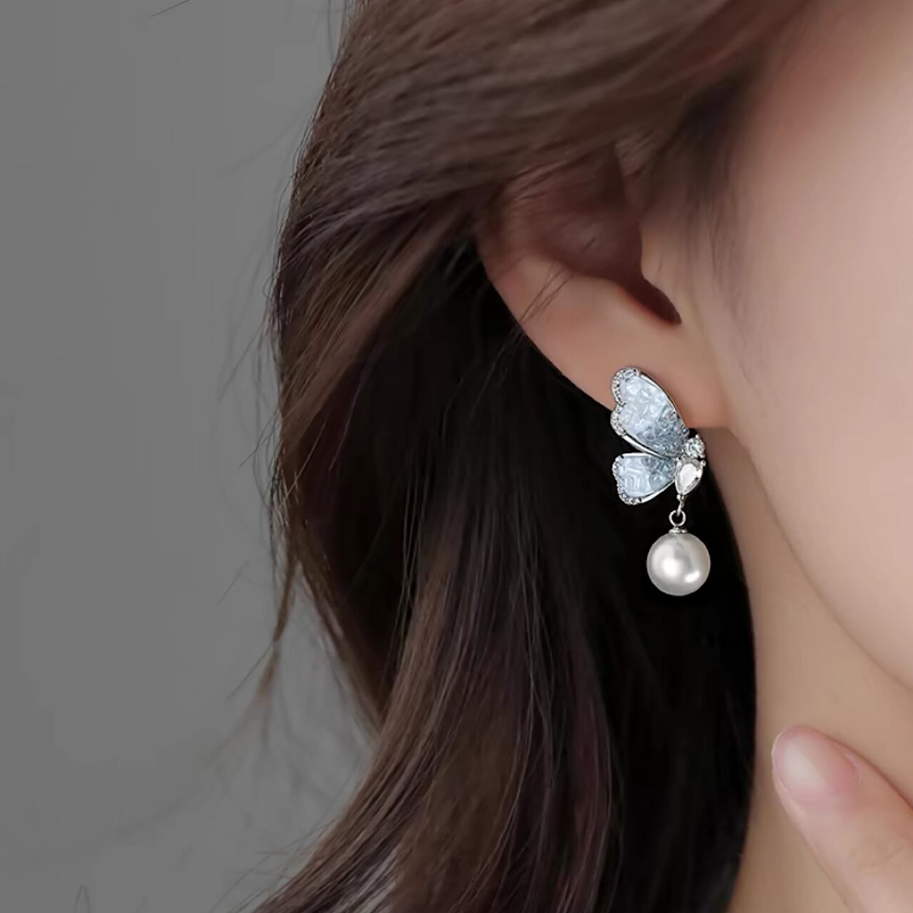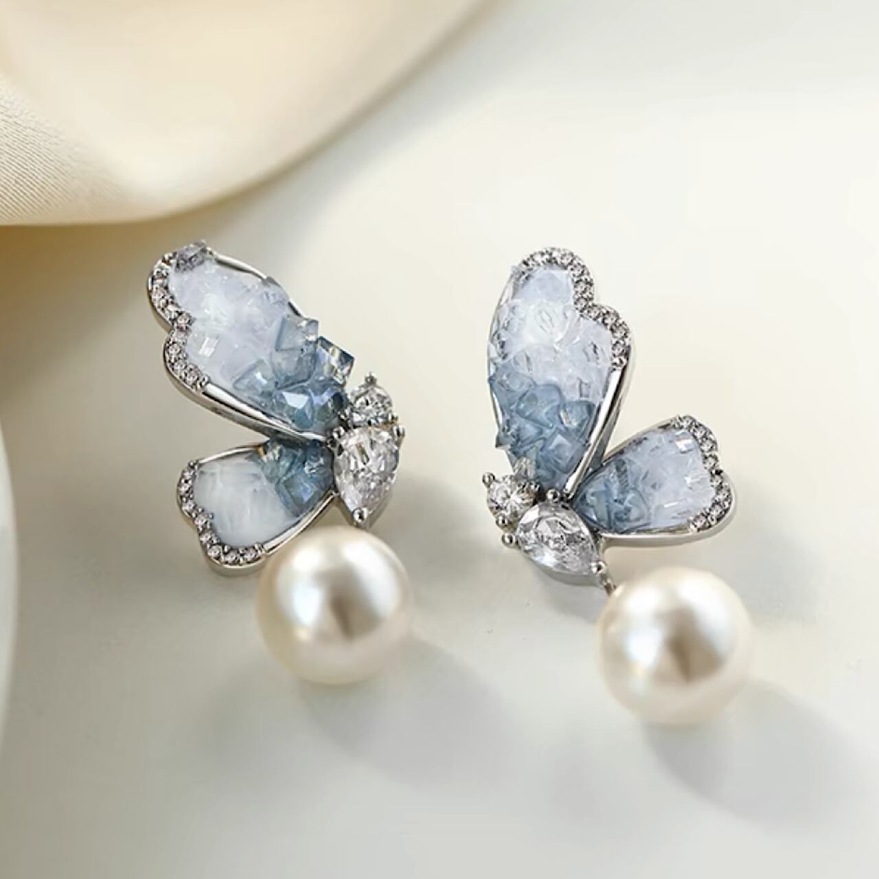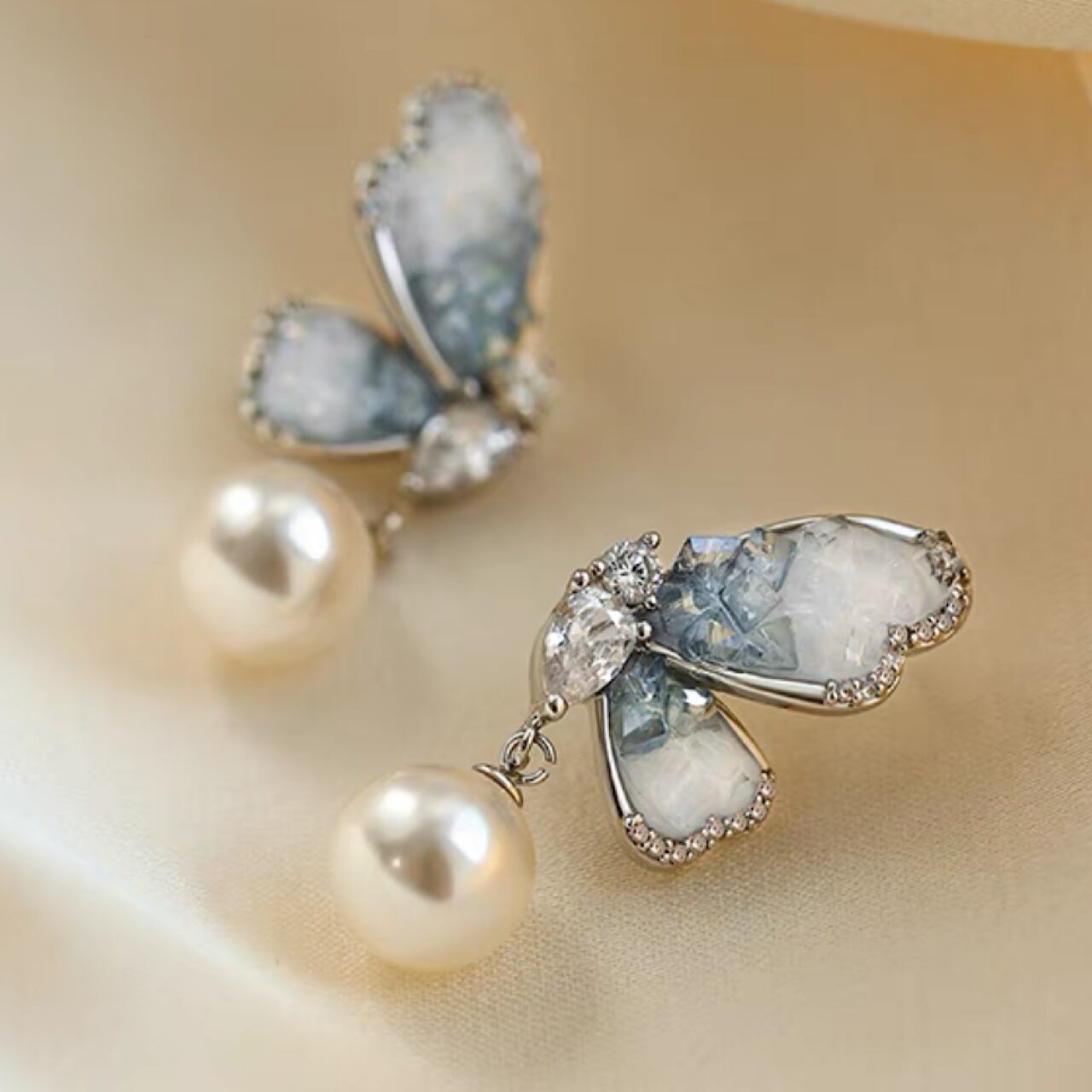おしゃれ ブルー×ホワイト キラキラ 蝶々 パール イヤリング